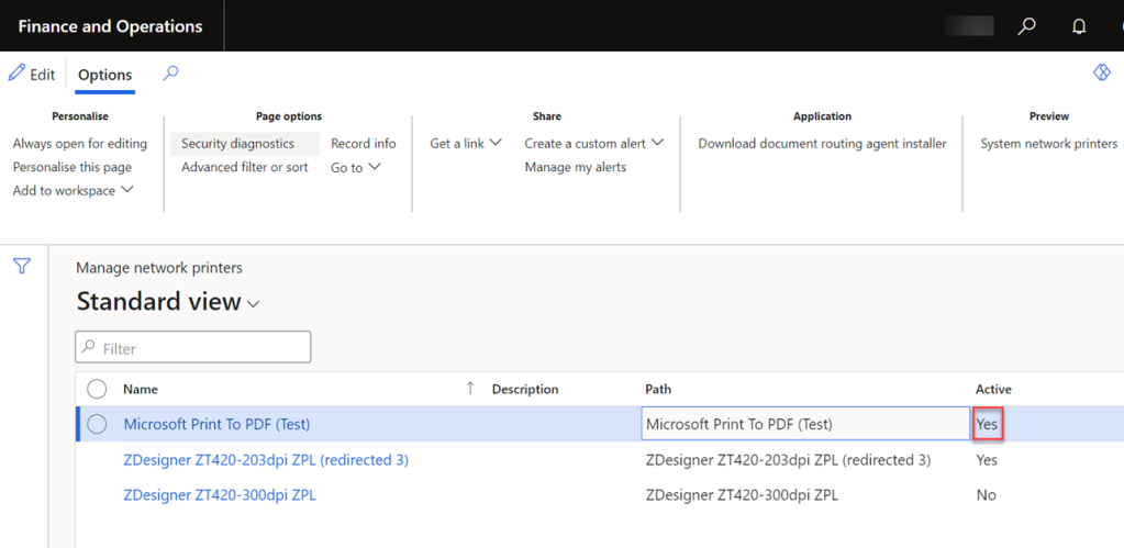 - After registering the printer, it will be visible in D365 F&O. Activate the printer.