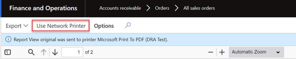 - Now, you can test it in your reports by using Network Printer as shown below (after printing to screen), or setting up the print management.