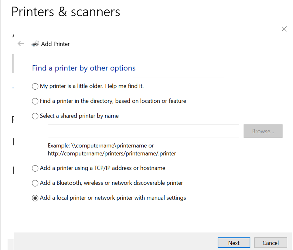 - Click on ‘The printer that I want isn’t listed.’