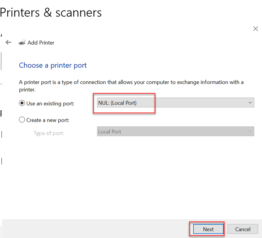 - Select Nul port and click Next.