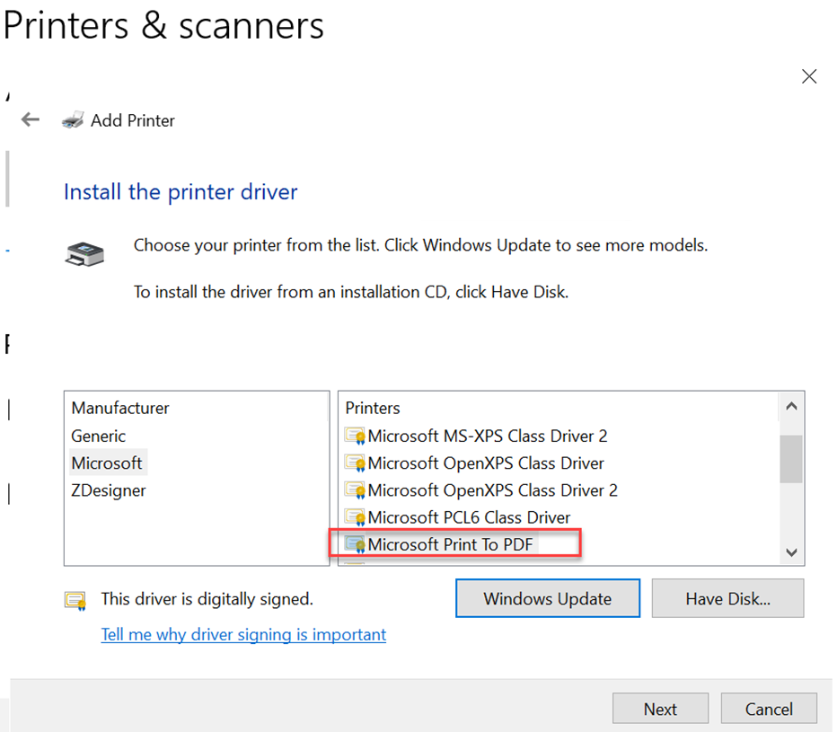- Select Microsoft Print to PDF and click Next